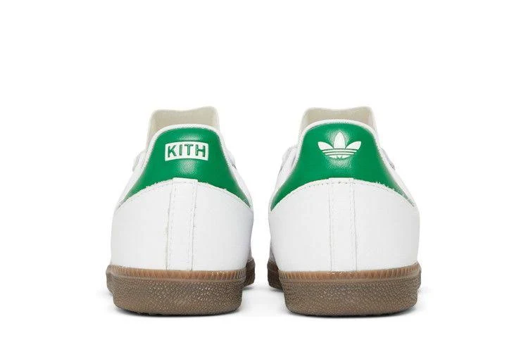 The upper of the adidas Samba OG Kith Classics White Green is constructed from premium leather. The adidas 3-Stripes are present on the sides of the shoe in a Fairway color. The Kith classics branding is visible on the side, while the tongue also features adidas and Kith branding.