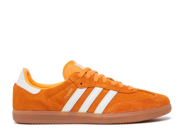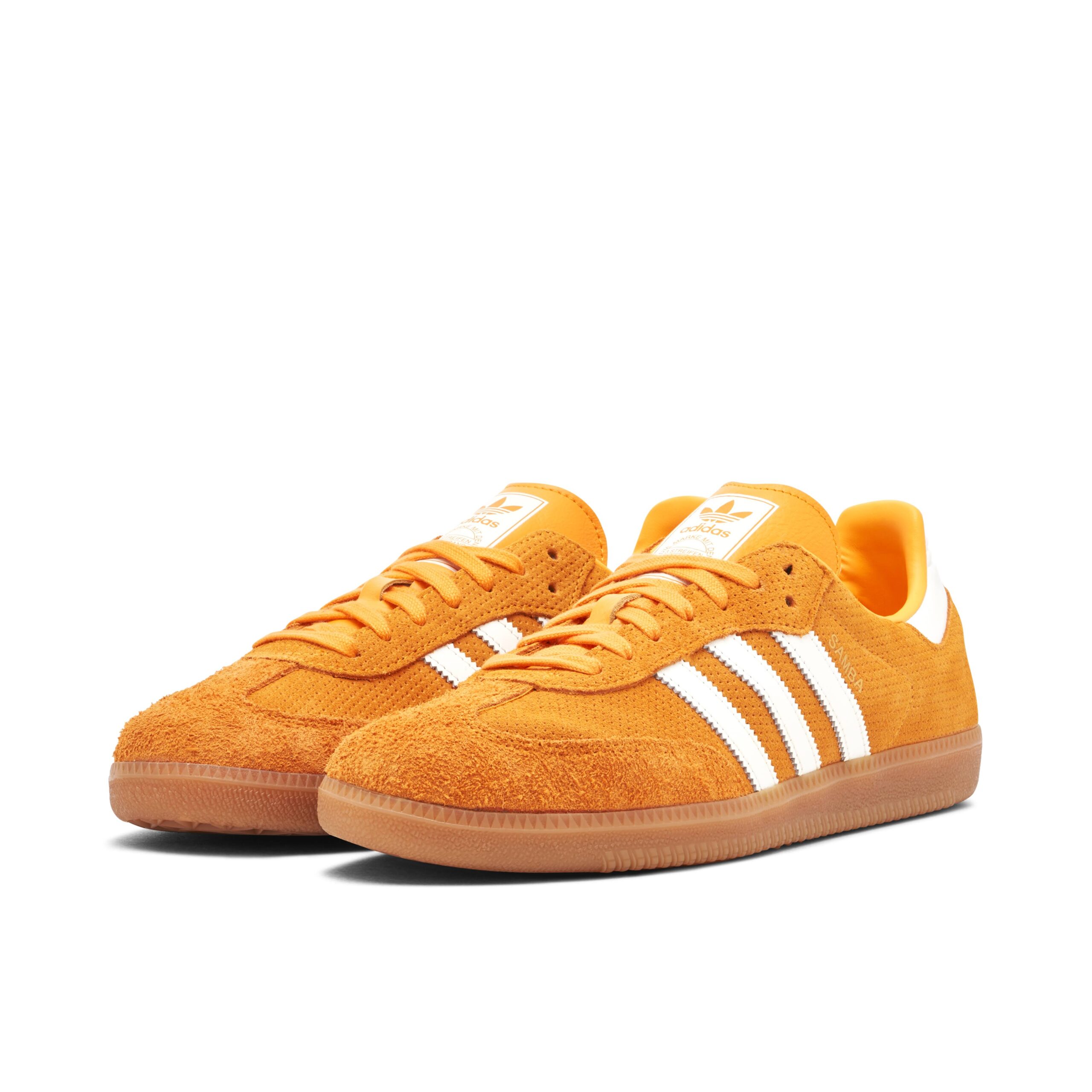 This adidas Samba OG has a leather upper that is almost entirely orange except for some white on the tongue tag and heel and the white that was used for adidas’ Three Stripes logo. The sneaker also comes with a set of laces that are a slightly lighter shade of orange and a gum rubber sole that contrasts the colors found on the rest of the shoe nicely.