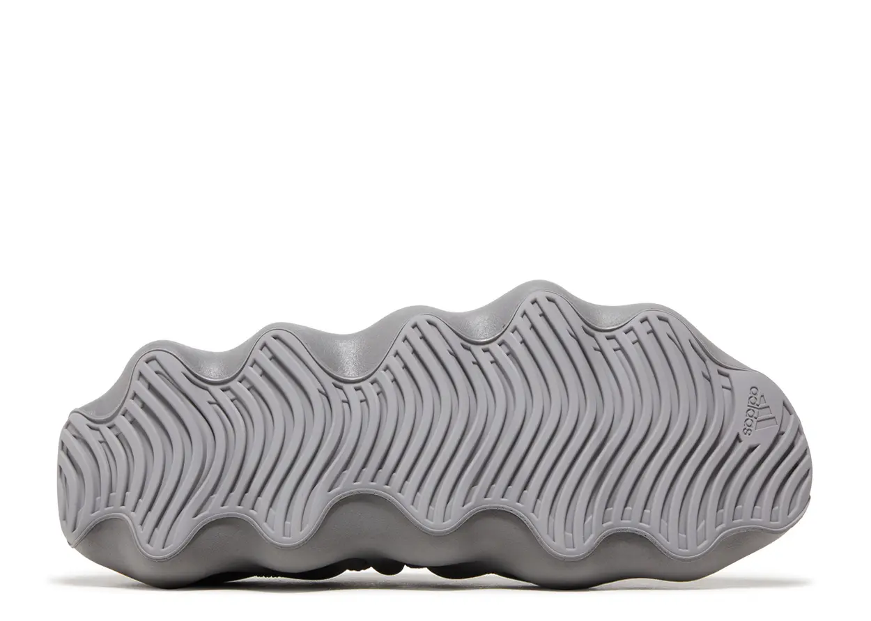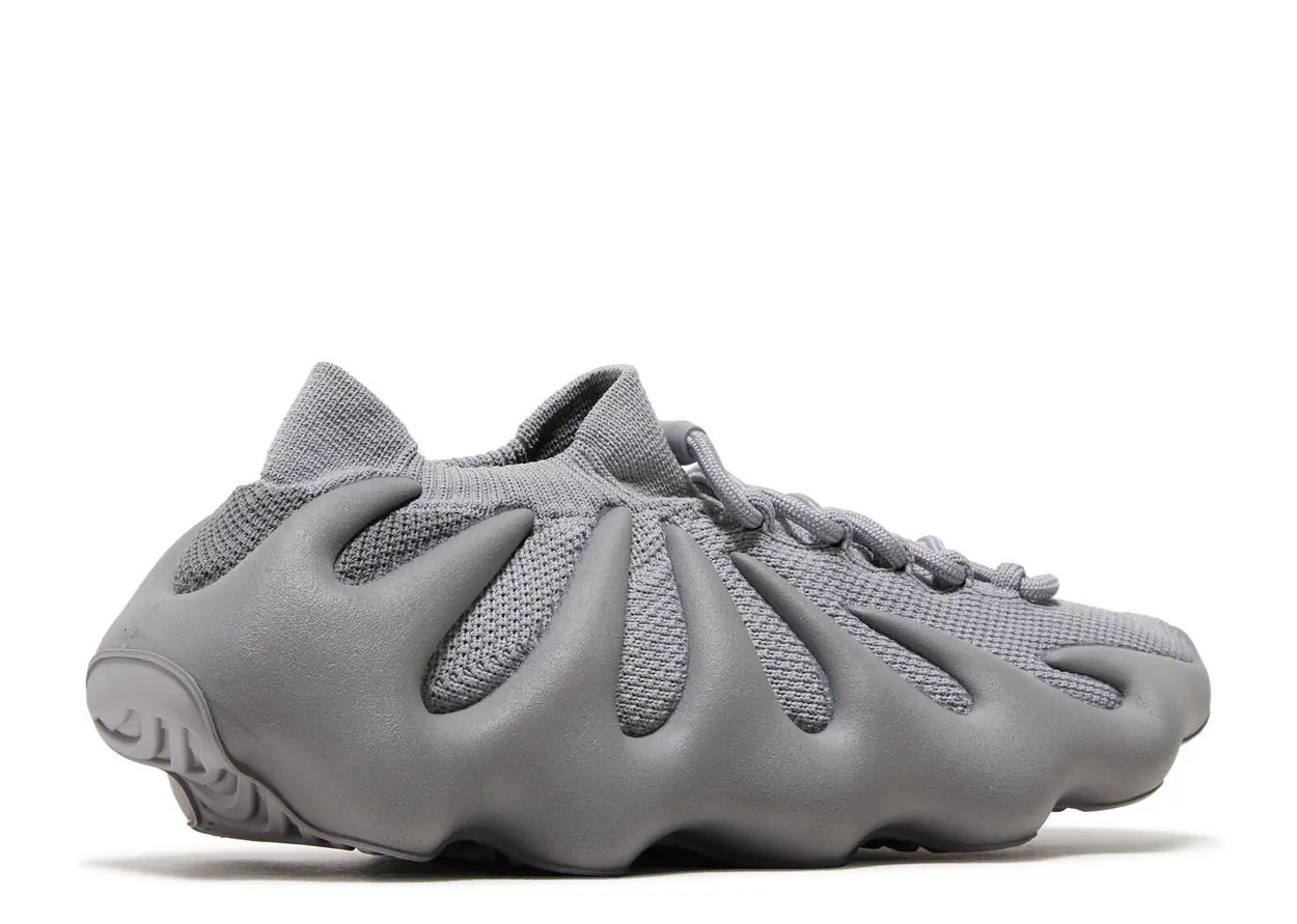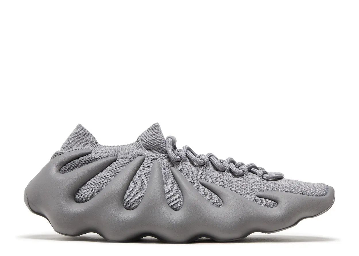 The Yeezy 450 is a modern lifestyle sneaker featuring a seamless one-piece knit textile upper. It has a monochromatic color palette featuring a light grey hue and an avant-garde design aesthetic with a sock-like fit, elastic collar, and traditional lacing system. The shoes also have a molded rubber sole that extends to the sides of the shoe, creating a cage-like structure that not only adds aesthetic value, but also has functional importance.