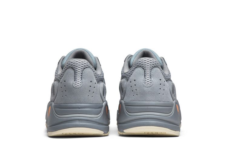 The adidas Yeezy Boost 700 Inertia. This Yeezy Boost 700 comes with a grey upper, grey midsole with orange accents, and a white sole.