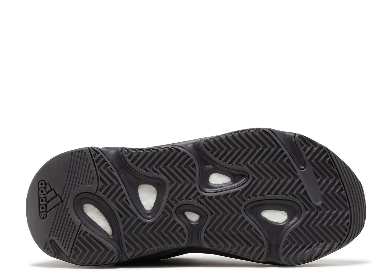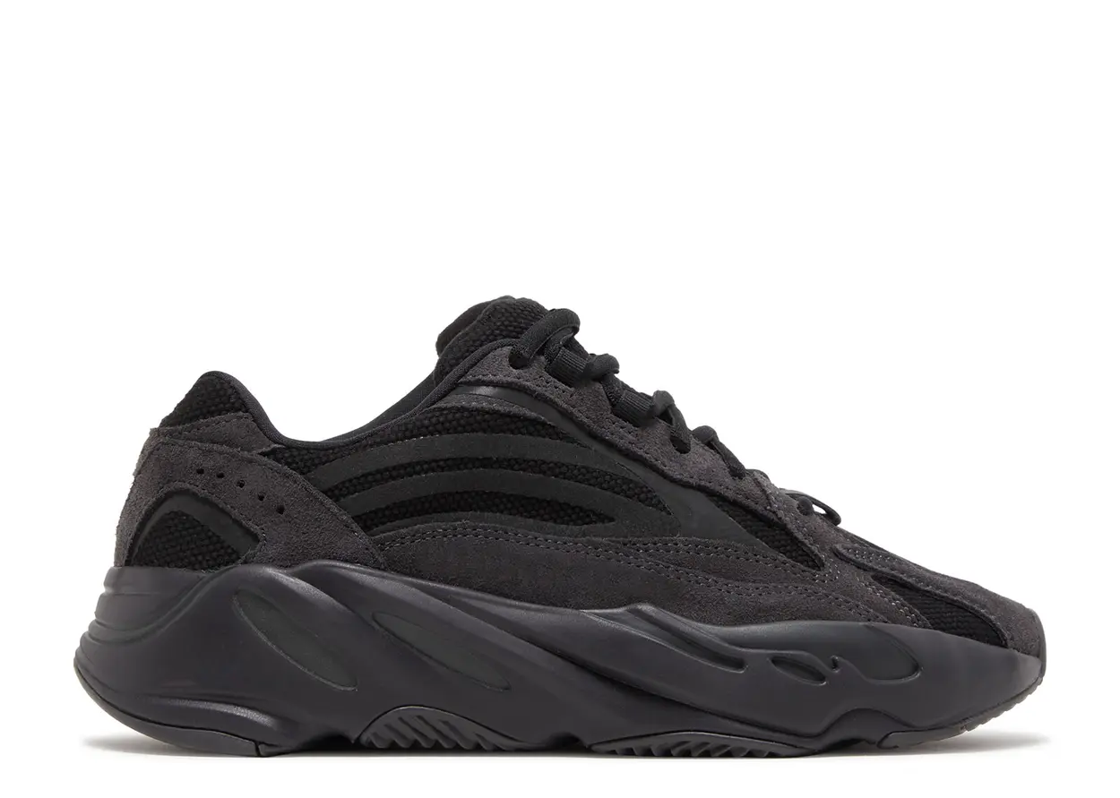 The adidas Yeezy Boost 700 V2 Vanta features a muted, all-black mesh, leather, and suede construction in a styling influenced by 1990s running shoes. At the base, a Boost-cushioned sole adds comfort and support.
