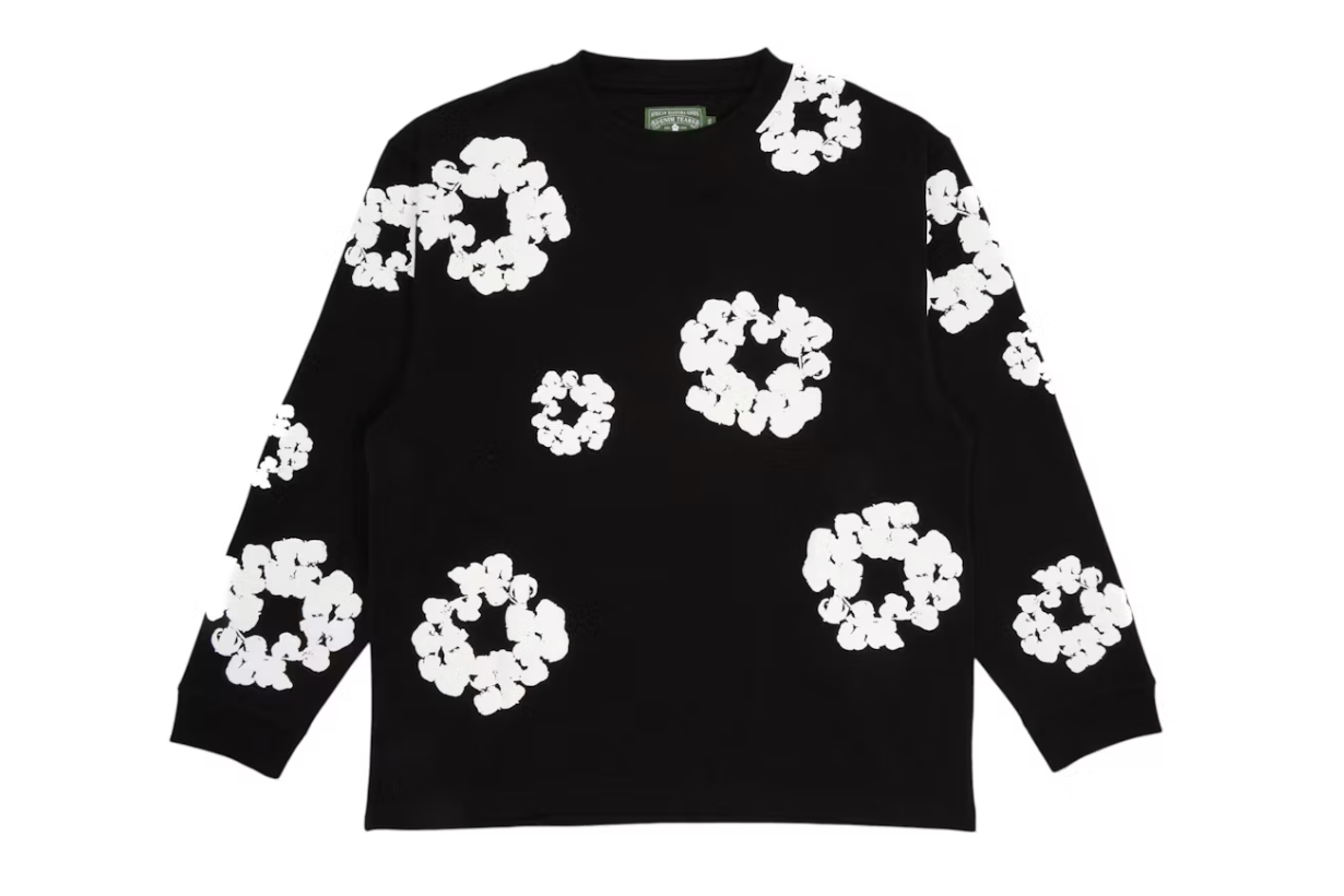 The black colorway provides a sleek canvas for the distinctive Cotton Wreath graphic, creating a powerful visual statement. The long-sleeve design adds versatility, making it suitable for various seasons and occasions. Whether paired with jeans for a casual look or layered under a jacket for a more refined ensemble, this t-shirt effortlessly blends streetwear aesthetics with thought-provoking design.