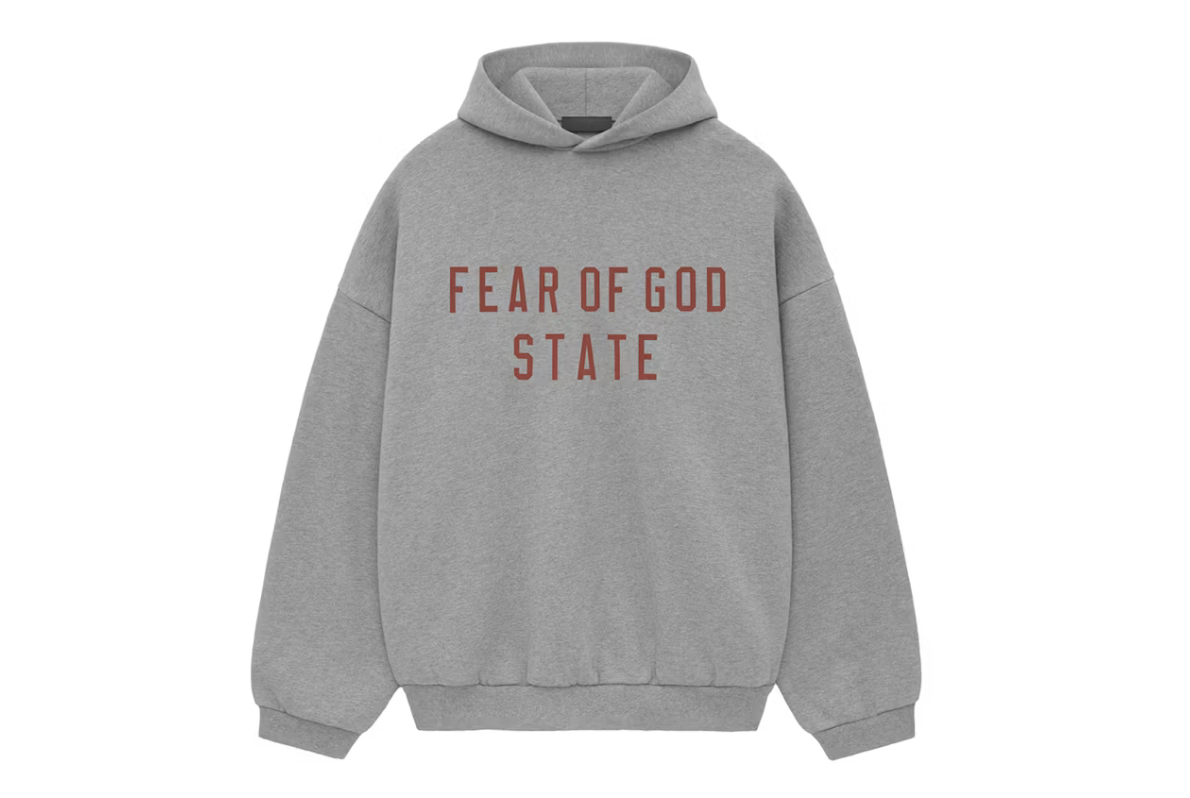 This version of the Fear of God Essentials Fleece II Hoodie comes in a Dark Heather grey colorway that dominates most of the design. The words “Fear of God State” appear in thin, burnt orange letters on the front. The back has no design. The item is made from polyester and cotton for comfort and warmth, and the cuffs and hem are elastic for better heat retention. It also has dropped shoulders for a more relaxed fit. A logo patch also appears on the hood.