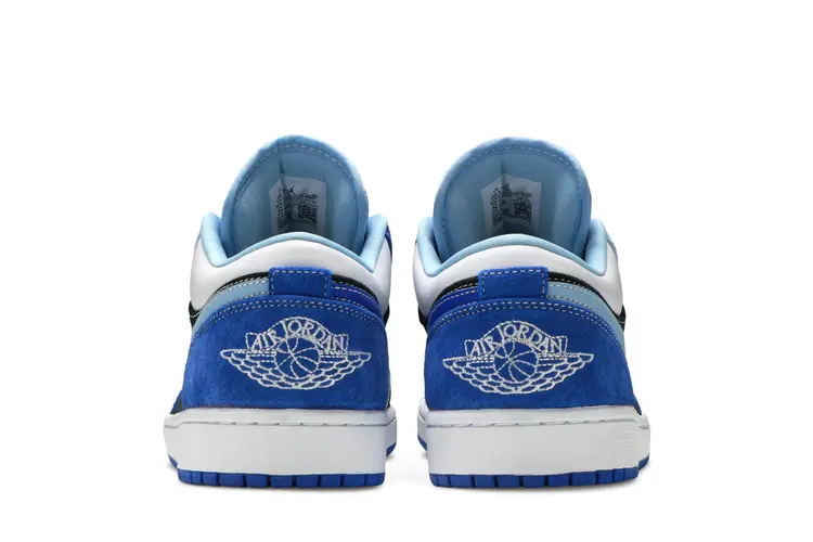 The shoe’s body is a crisp white color with black leather details on top. The ‘swoosh’ symbol that is famously associated with Nike appears in the middle of the shoe's side in a light blue color. This shoe model has standard tread. The majority of the shoe is composed of leather.