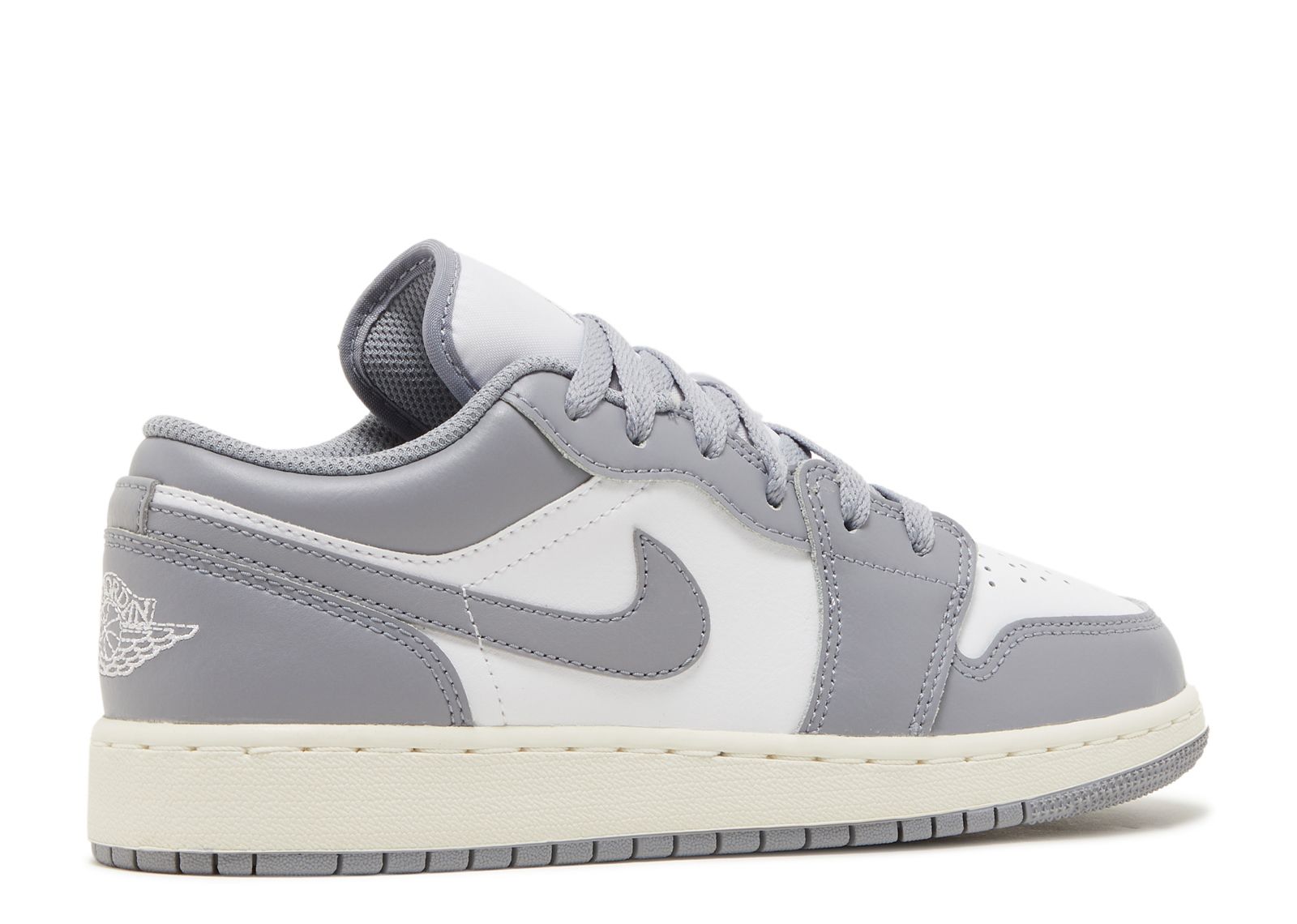 The Vintage Grey Air Jordan 1 Low Gradeschool has a pristine white leather upper and perforated toe box. This is accessorized with gray overlays, laces, Swooshes, heel cap, and rubber outsole. There’s an embroidered gray Jumpman logo on the white tongue and insole. Inside the shoe is a gray, padded mesh fabric. The shoe also features white wings on the heels. A vintage-style rubber midsole completes the design.