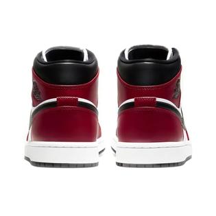 The Jordan 1 Mid Chicago Toe features a black, white, and Gym Red leather and nylon upper. From there, a nylon tongue featuring a black "Jumpman" logo set and a white midsole complete the design.