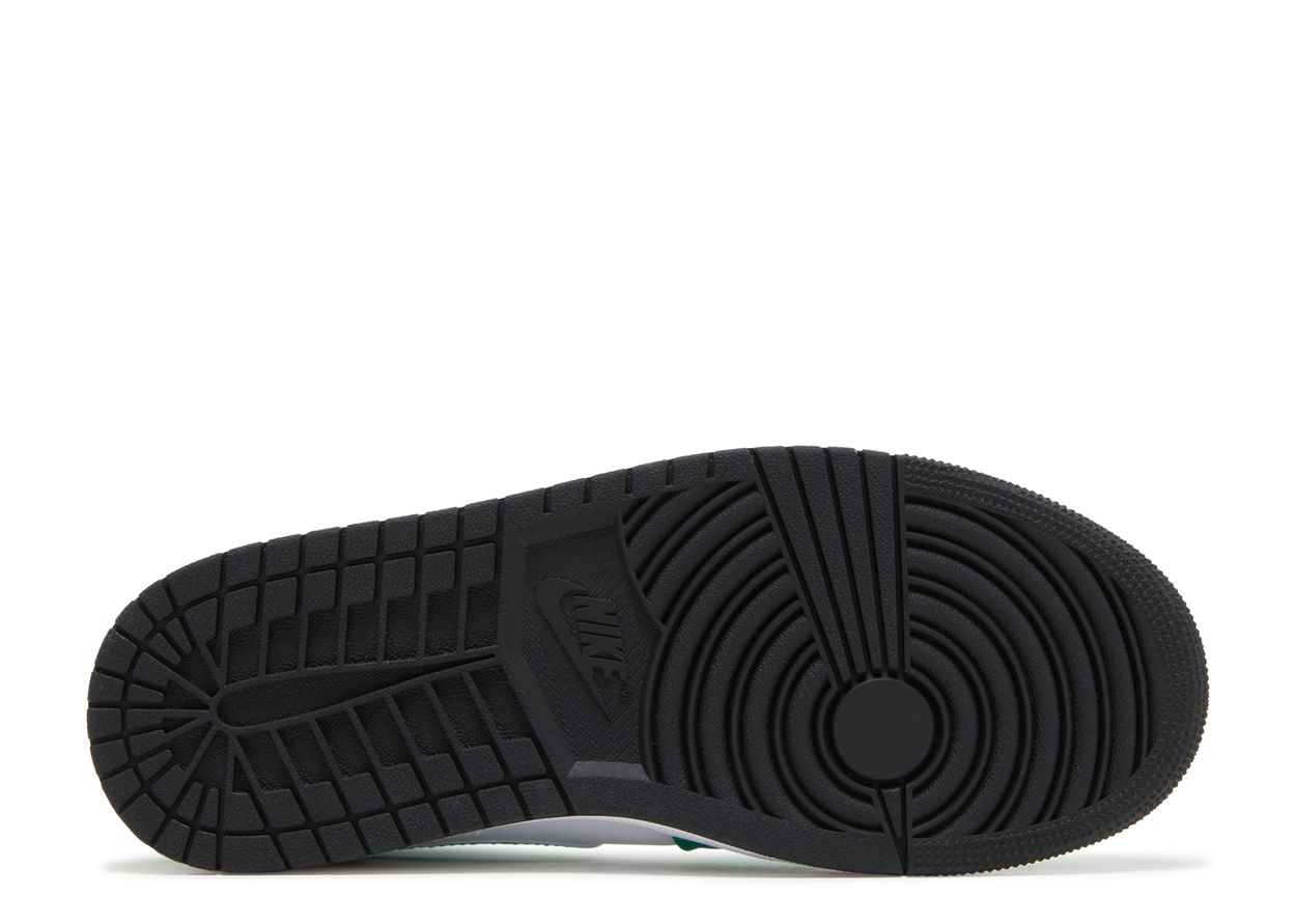 The upper of the Jordan 1 Mid with a Lucky Green/white/black colorway has a side panel, collar, and perforated toe box made of white leather. Green leather overlays on the mudguard, vamp, heel counter, eye stays, and collar match the green leather Swoosh and the green nylon tongue. The white laces match the upper and the white Foam midsole with encapsulated Air cushioning.