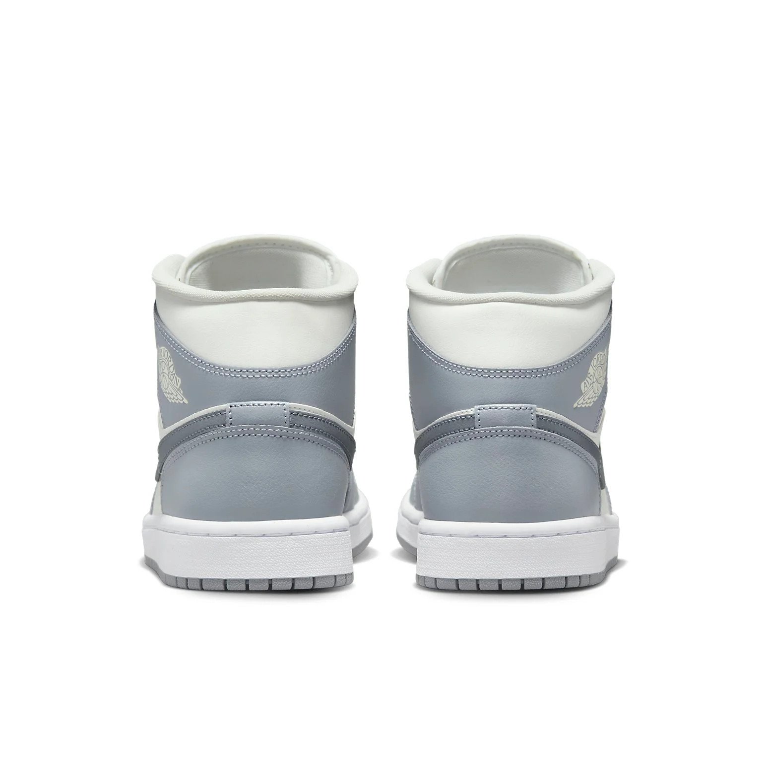 This Mid Air Jordan 1 for women is made of leather. Contrast is created between the sail foundation and the panels of stealthy grey which wrap all around heel, toe box, and ankle. The winged basketball image is debossed on this sneaker's collar. This shoe also has a Nike's Swoosh logo that boasts on medial and on the lateral sides. A solid grey rubber outsole and a white Air-cushioned midsole complete the design.