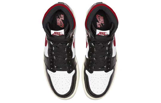 Shiny black overlays wrap around the white leather upper. The winged Air Jordan logo stands out brightly against the black leather. A red Nike swoosh logo appears on the side, accentuated by the red leather at the ankle.
