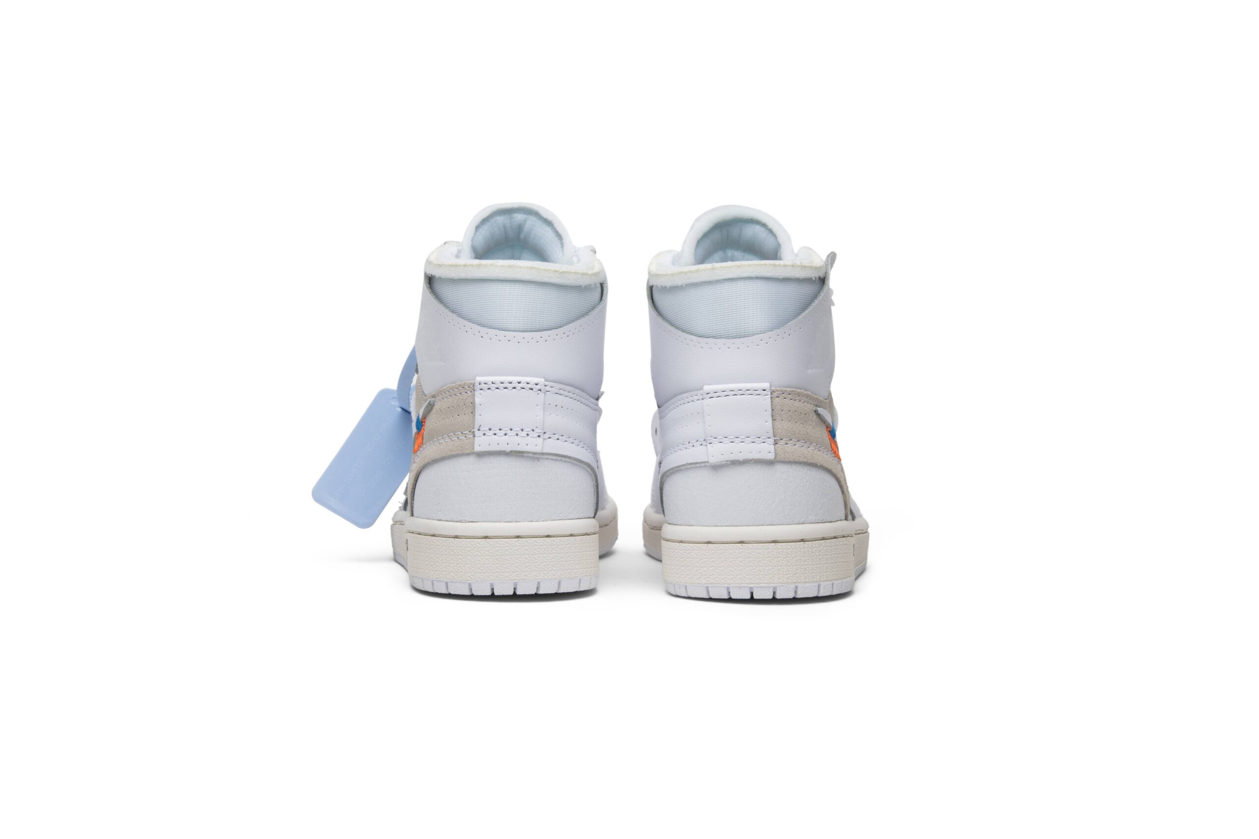 Crafted by Virgil Abloh, the Off-White Euro Air Jordan 1 grade school kids showcases a premium blend of white leather and mesh for its upper and is accentuated by deconstructed swoosh branding and blue highlights. Notably, wings logos adorn the ankle area, while the midsole boasts black "AIR" lettering. The shoe is further distinguished by the inclusion of black "Off-White for NIKE" text on the side panels and striking orange tabs.