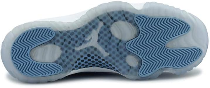 This sneaker’s upper consists of a white mesh base surrounded by a University Blue leather overlay. Branding-wise, it boasts a Jumpman logo on its heel and an embroidered Jumpman Jordan strip on the center of its tongue. This shoe’s upper is held in place by an ice-blue translucent outsole characterized by constrict patterns for underfoot grip.