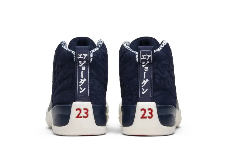 The Air Jordan 12 Retro ‘International Flight’ gives the nod to Jordan’s role as an ambassador, releasing as part of an International Flight Collection that celebrated important trips. This shoe recognizes his 1996 trip to Tokyo, featuring a kimono-style print throughout its College Navy suede upper and a koi scale pattern replacing the usual basketball texture on the mudguard. The characters down the heel strip translate to ‘Air Jordan.’