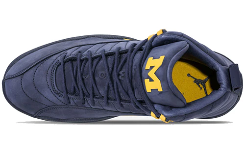 The Air Jordan 12 'Michigan' was originally released as a Michigan exclusive and then released to the public in 2019. Draped in the colors of the University of Michigan, the shoe features an upper molded suede in navy, in contrast to Amarillo's midsole shank accents, upper eyelets, and 23 branding. The two versions are very comparable, but the lining and heel tab have small changes. Finally, to complement the college look, the Michigan logo appears on the tongue.