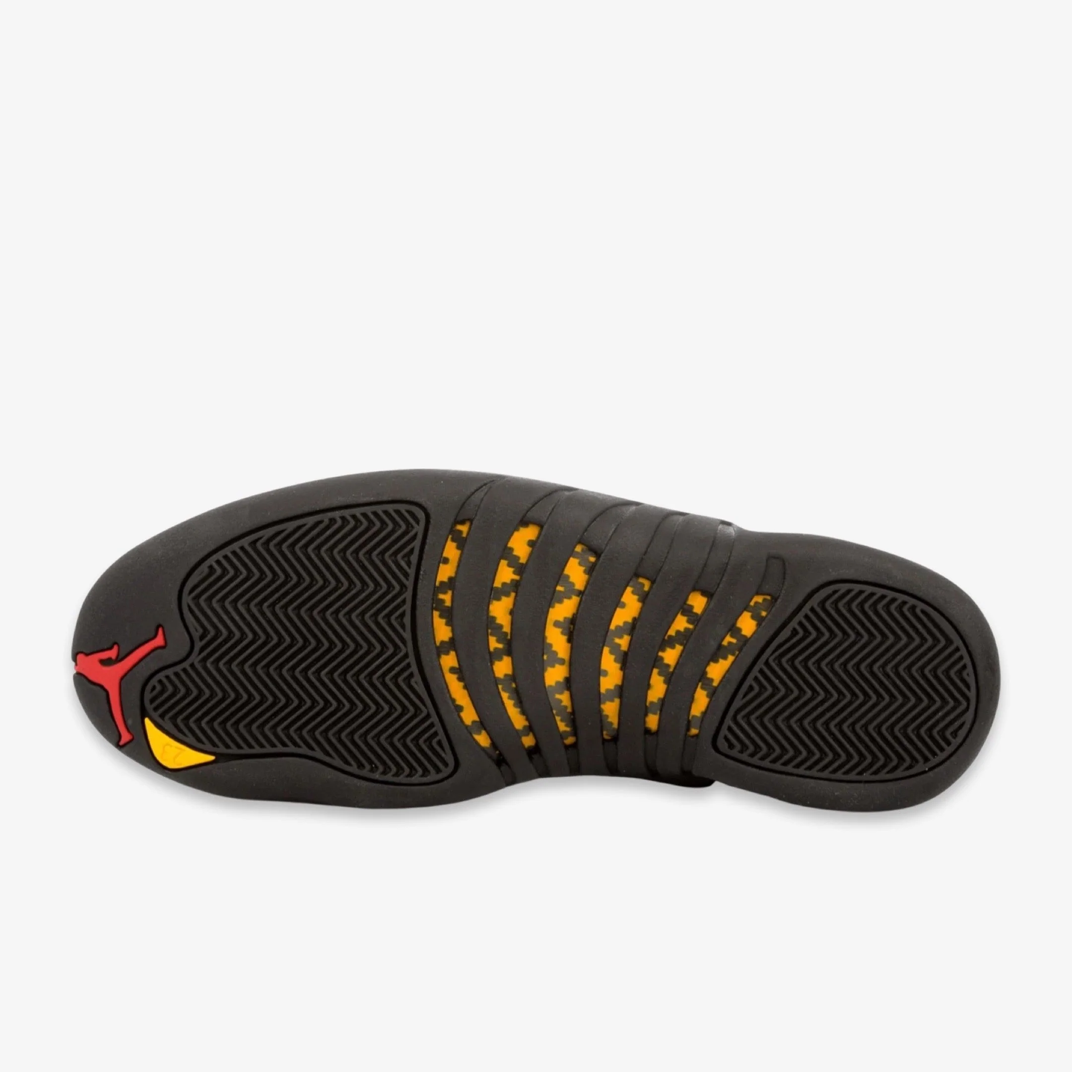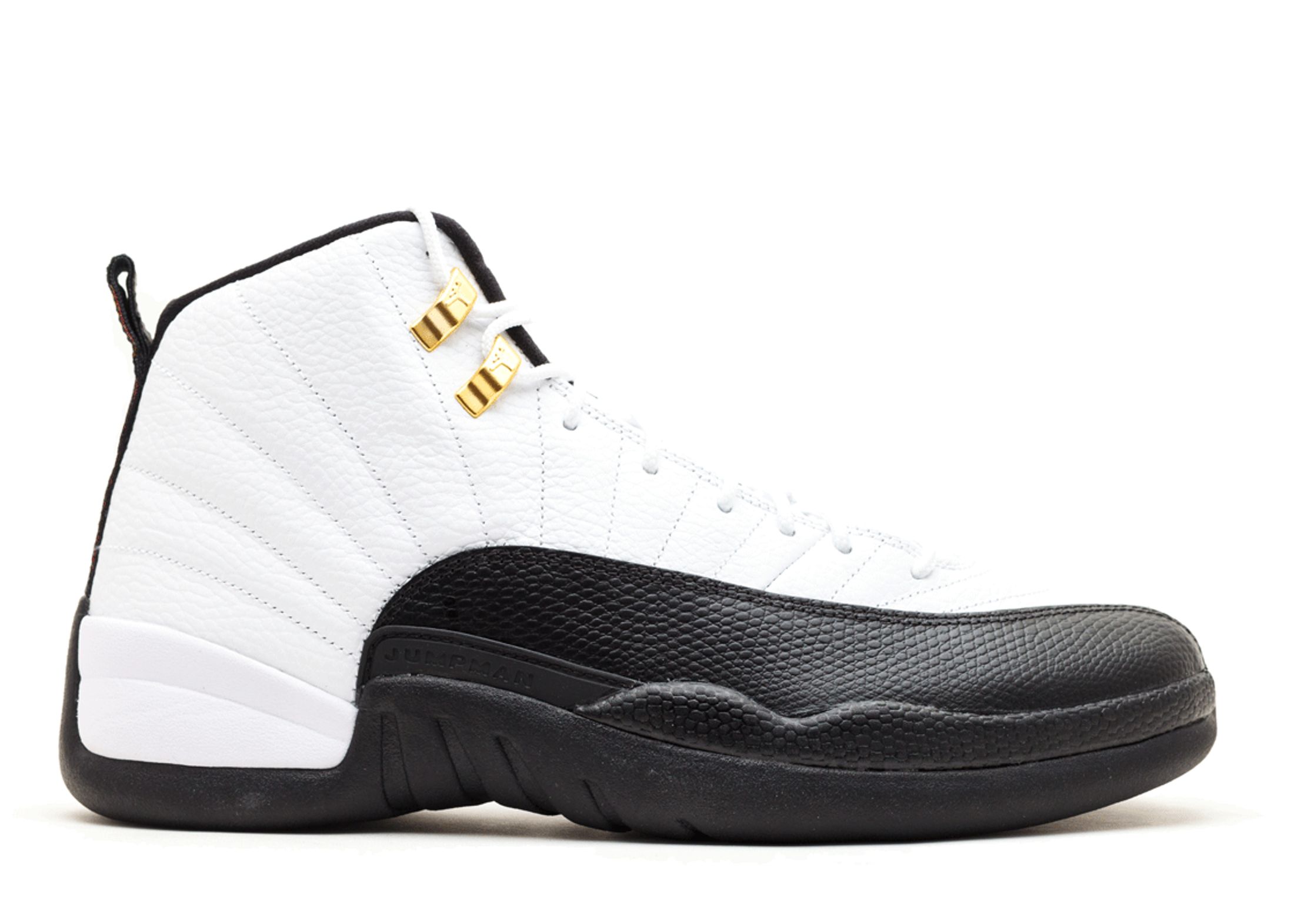 The Air Jordan 12 Retro Taxi 2013 features a a black outsole, metallic gold eyelets, and a white upper. The heel strip is styled with a red '23' on a black backdrop and a yellow/red Jumpman emblem. Jordan 12 Retro Taxi 2013 release shoes pay tribute to Michael Jordan's 5th championship season (1996 – 1997). The mostly black sole includes a yellow/black design and the iconic Jumpman logo in red.