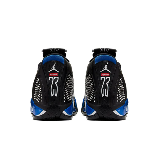Jordan Brand teamed up with Supreme to create the Supreme x Air Jordan 14 Retro SP 'Black Varsity Royal,' released in June 2019. The shoe features a premium leather construction in black, outfitted with metal studs throughout the design. The signature Jumpman badge at the ankle sports co-branding, as do the heel, tongue and vamp. Underfoot, Zoom Air works with a shank plate to provide cushioning and support, with a herringbone pattern on the outsole for traction.