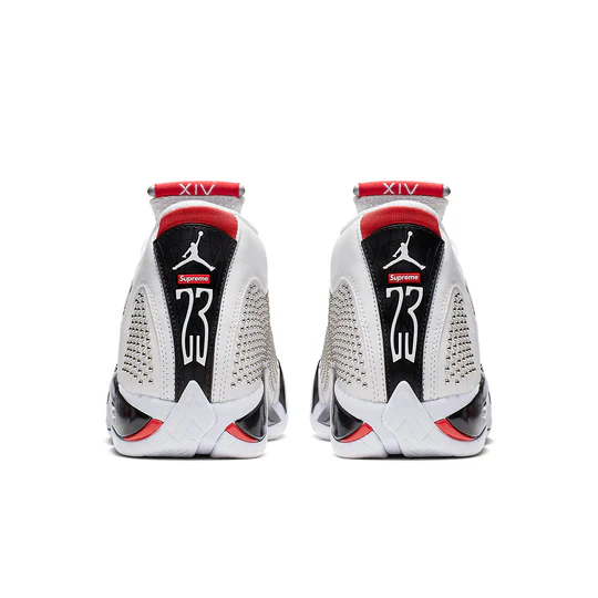 Supreme and Jordan Brand teamed up again to create the Supreme x Air Jordan 14 Retro SP 'White.' The shoe's upper is built with white leather, accented by metal studs throughout the construction. A co-branded badge stands out on the ankle, with further co-branding on the heel. Finished in a familiar mix of white, black and University Red, the shoe is supported underfoot by a shank plate and Zoom Air, with the rubber outsole sporting a herringbone pattern for traction.