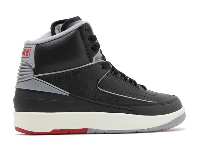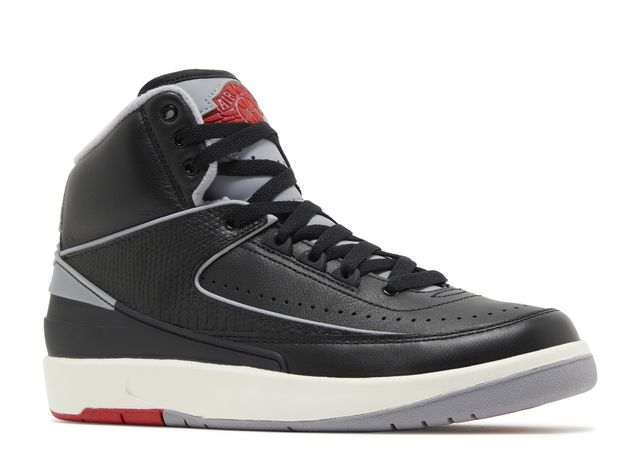 The Retro Air Jordan 2 in Black Cement has a shape that is reminiscent of the original 1987 Air Jordan style. The upper body of the shoe is made from Jet Black leather. There are Cement Gray accents that line the midfoot and are included on the tongue and the heel foxing. The laces are the same Jet Black as the body. The sneaker has a high profile, which helps to achieve fast movement on the basketball court, AIR pods for cushioning, and a round toebox with perforations for breathability.