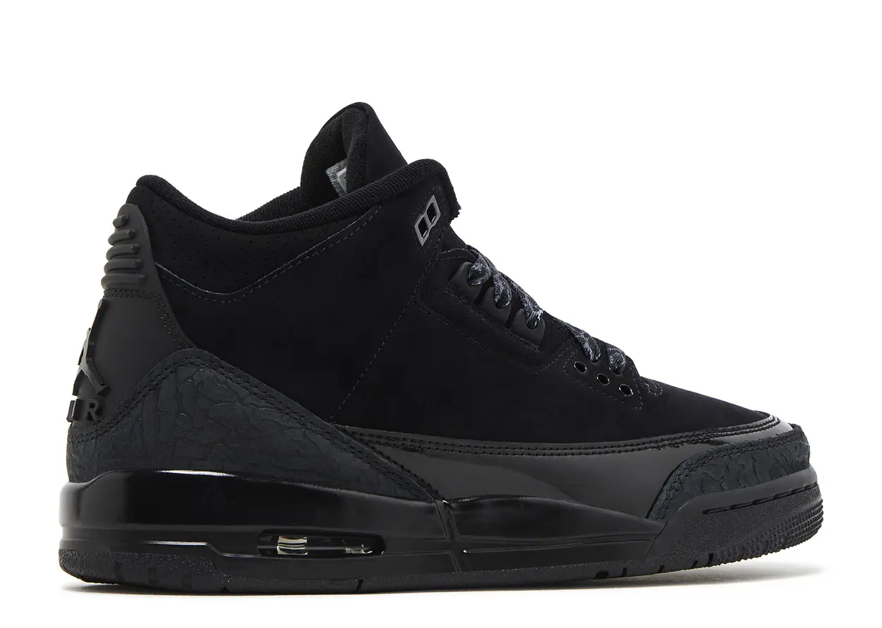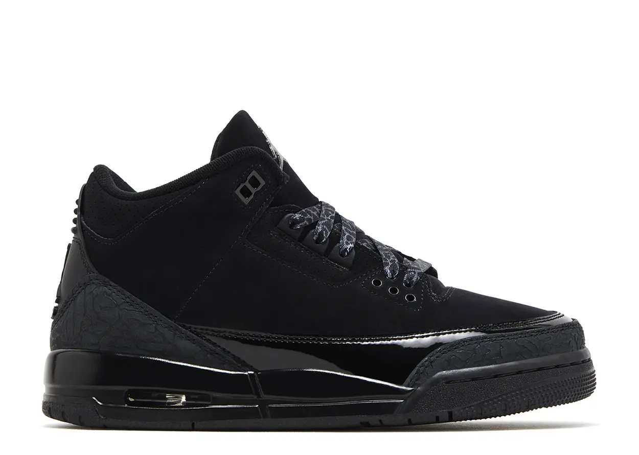 The Jordan 3 Retro Black Cat (2025) (GS) is a sleek and stylish sneaker designed for the younger generation. This Grade School edition showcases a monochromatic black colorway that pays homage to the iconic 'Black Cat' nickname of Michael Jordan. The upper is crafted with premium materials, featuring a combination of smooth and tumbled leather for a luxurious look and feel. The signature elephant print detailing on the toe and heel adds a classic touch to this modern iteration.