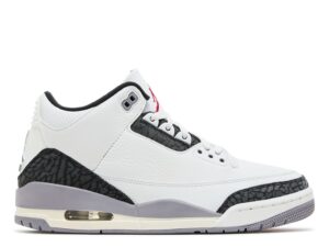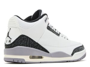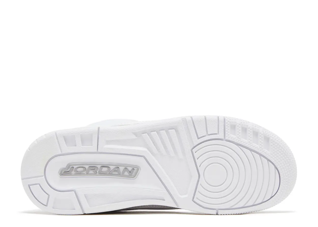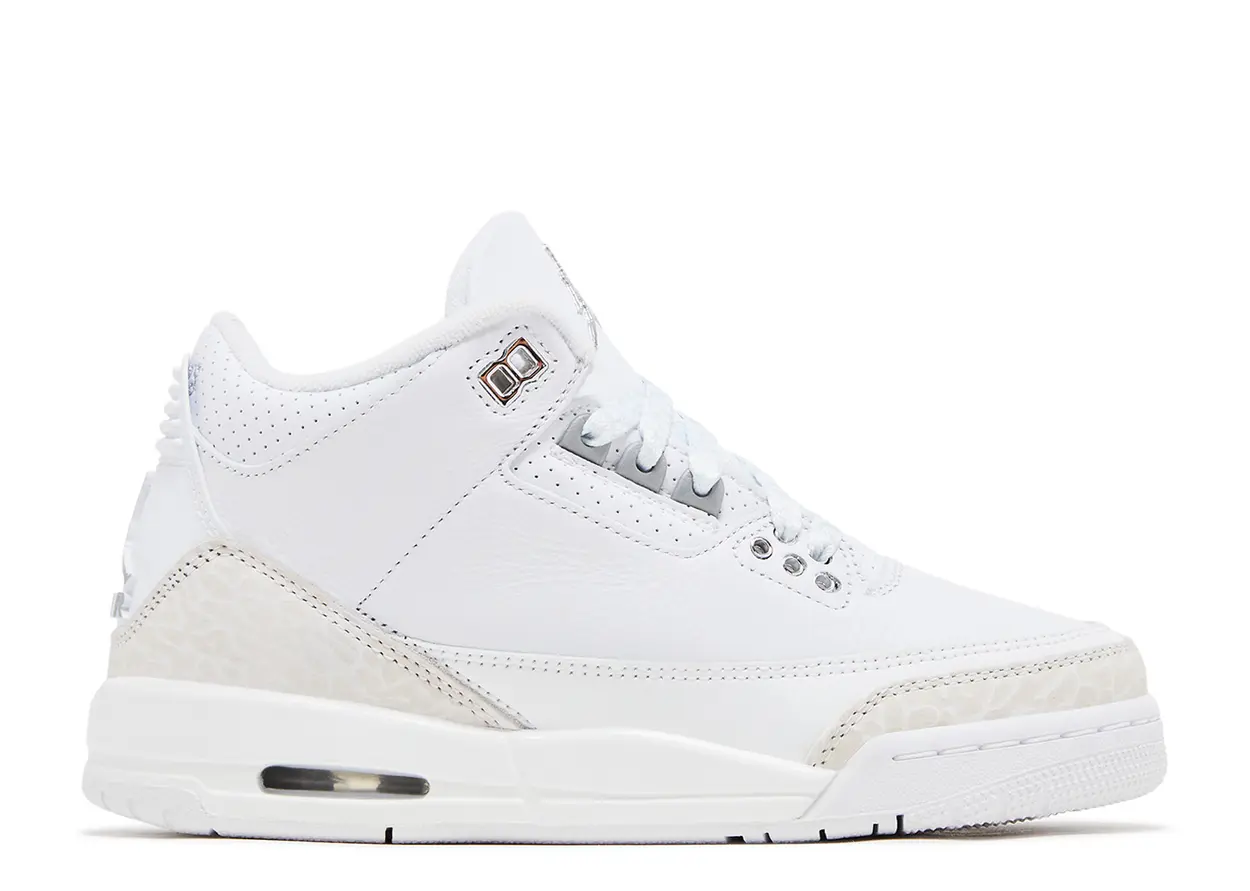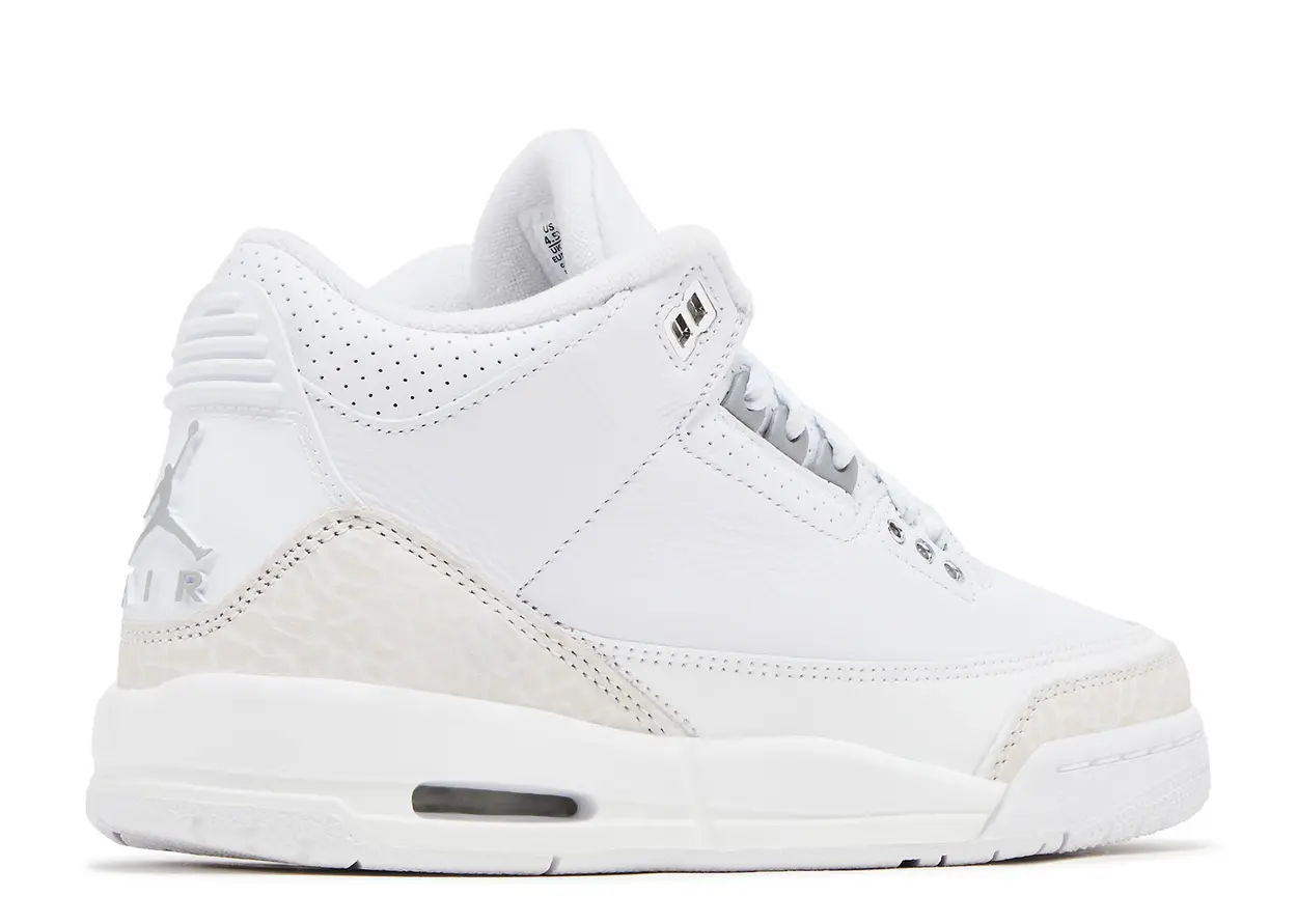 The 2025 version of the Air Jordan 3 GS ‘Pure Money’ rolls out a white tumbled leather upper bolstered by light grey elephant print forefoot and heel overlays. White micro-perforated leather lands on the eyestay and collar, while a metallic silver Jumpman logo adorns the tongue and heel tab. A white foam midsole contains Air-sole cushioning in the heel for a resilient feel.