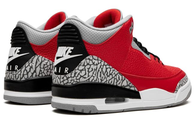 A red leather base that is accented by an elephant print is featured in this Retro SE Air Jordan 3 for grade schoolers. The design also boasts details such as a black heel tab contrasted with white “Nike Air” branding and black laces. The cement-grey tongue displays a red-dressed Jumpman logo. To complete the design is the sneaker’s white midsole atop a grey outsole that is accented by a black heel tab.