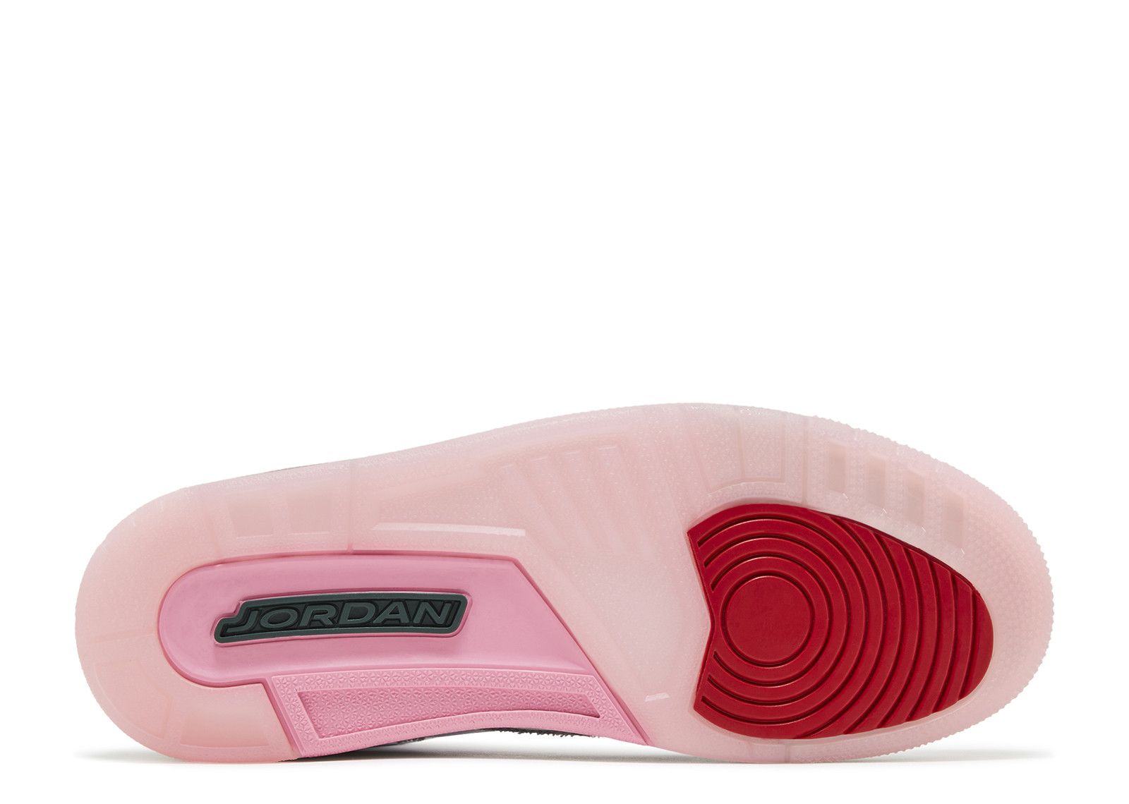 The Wings Jordan 3 Retro design features a classic elephant print on the heel and toe, as well as an upper crafted from denim twill and smooth leather in white. The denim twill displays a repeating pattern of roses, leaves, and stems that complements the delicate rose motif on the heel. The rose features pink petals with yellow-orange leaves and a thin stem. The rubber outsole in Rose provides traction underfoot and matches the floral theme, while air cushioning in the off-white midsole provides a responsive feel.