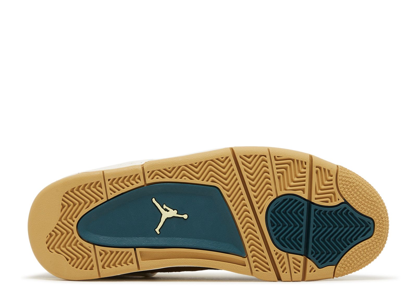 The sneaker features a soft suede and mesh upper, while the forefoot overlay is crafted from leather. The shoe also features textile details that layer beneath the forefoot overlay and completely wrap around the sneaker. The colorway features natural, chocolate-inspired hues, including Cacao Wow, Geode Teal, Ale Brown, Twine, Sail, and Luminous Green. The sneaker comes in the signature Air Jordan 4 high-top silhouette with a visible Air Sole unit in the heel.