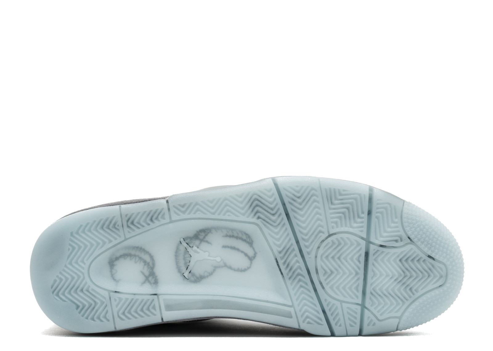 The suede upper of this Air Jordan 4 model has a mix of heathered and smooth textures throughout, and it is bathed in a tonal gray shade. The upper of this shoe also boasts carved KAWS hand designs and a matching hang tag. Suede material is also used to wrap the upper "Wings" and the midsole. Air units are included in the soles.