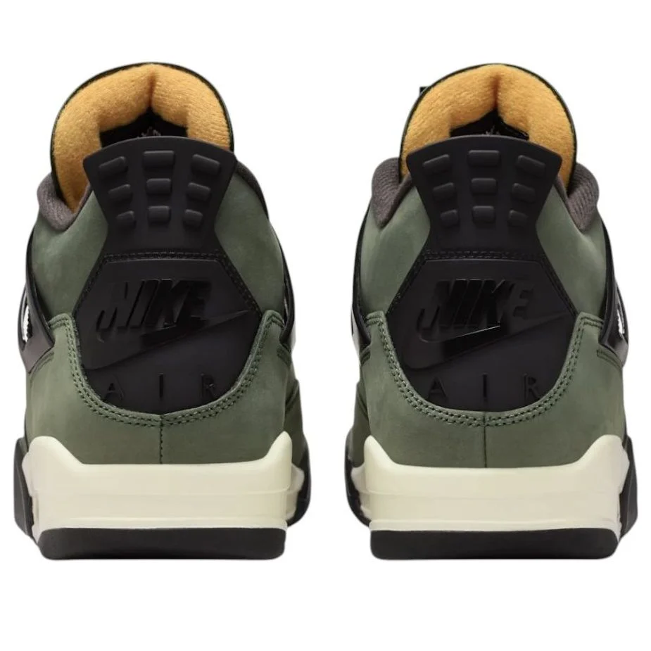 The Undefeated x Air Jordan 4 brings back the collab that initially dropped in 2005, limited to only 72 pairs. Inspired by the MA-1 flight jacket, these shoes sport a deep green nubuck upper with contrasting black pops on the molded eyelets, supports wings, and Nike Air back tab. Hook-and-loop logo patches decorate the tongue, lined with orange knit inside. An off-white foam midsole pairs with a visible orange Nike Air heel unit to round out the look.