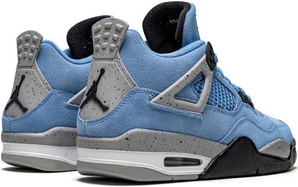 Released in 2021, the Air Jordan 4 Retro University Blue GS brings a silhouette with a suede upper and a popular shade of blue inspired by the University of North Carolina. It has a bright blue pallet often with a Jumpman icon on the back, tongue, and sole. The upper made from University Blue Suede and black plastic lace holders on its throat.