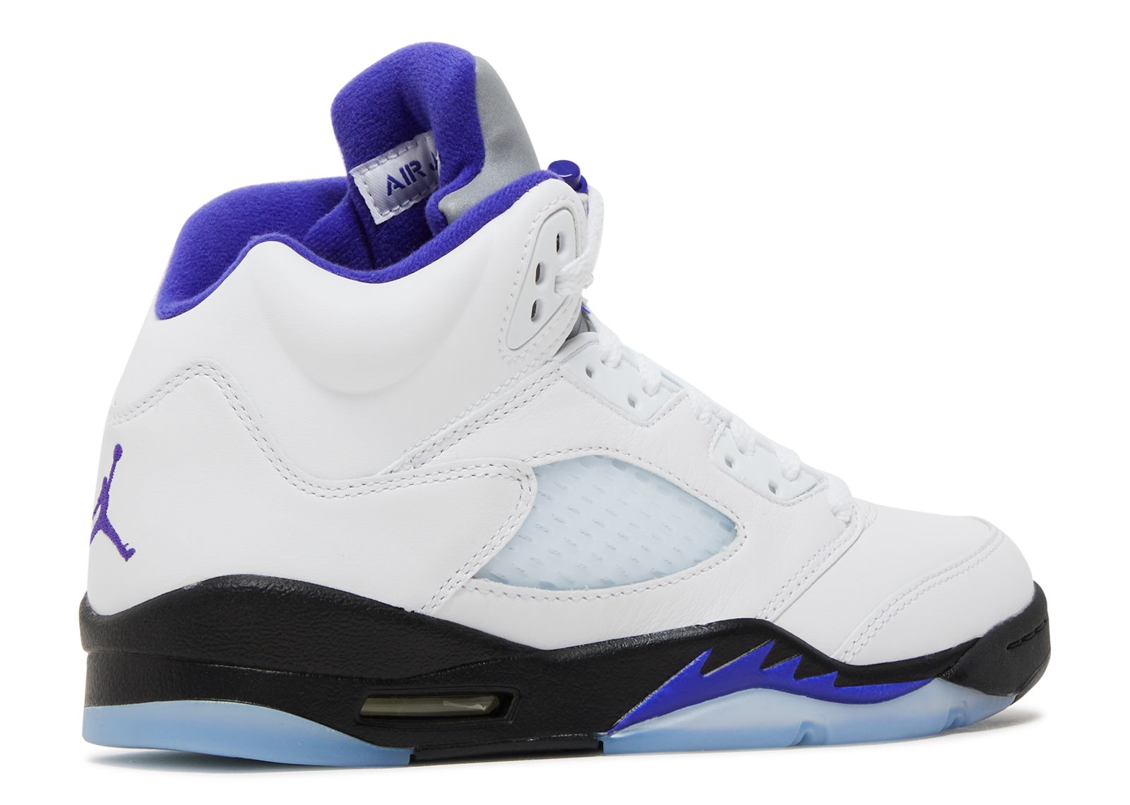 The new Air Jordan 5 Retro Dark Concord (Gradeschool) is features a dark concord, white, and black color scheme. The offering features a smooth, white leather top that is contrasted by bright purple hits. The white leather top is then paired with the concord contrasted accents and a sock-liner. The design is completed by reflective tongues and a black midsole on top of an icy translucent outsole.