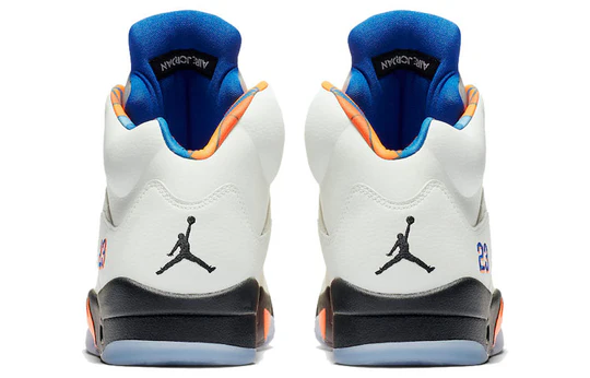 This Retro Air Jordan 5 sneaker features a sail leather upper, a reflective tongue, a black midsole, orange and royal accents, and a original graphic along the quarter mesh panels. The shoe's inscription is complemented by an icy blue translucent outsole, and the "23" PE style number is embroidered on the heels. AIR-unit soles complete the design.