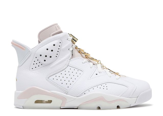 The women's Air Jordan 6 Gold Hoops (W) draws inspiration from gold hoop earrings and their allure. Its design is composed of a white tumbled leather upper with hints of pale pink on the tongue. From there, interconnected gold hoops and Jumpman emblems are attached to the shoe’s signature lace lock.