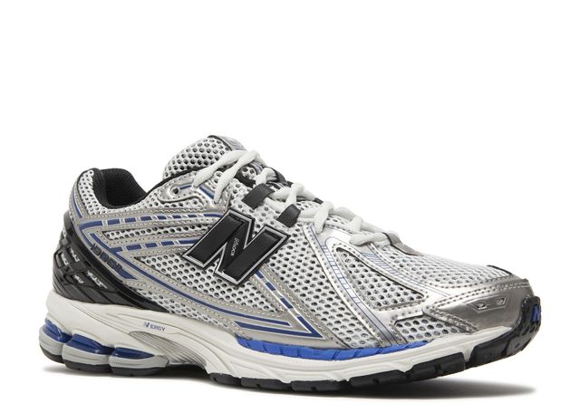 The Metallic Silver Blue iteration of the New Balance 1906R features an upper with a white mesh base that facilitates a lightweight stride and offers increased ventilation. Synthetic overlays in metallic silver and blue run across the shoe from the toebox to the collar, adding support and streamlined style. A black synthetic leather N on the side panel offers a hit of contrast to the off-white midsole composed of N-ergy and ABZORB that offers ultimate cushioning and impact resistance. The black and blue rubber outsole with Stability Web technology offers grip and allows for midsole expansion.