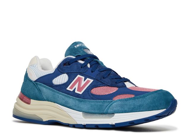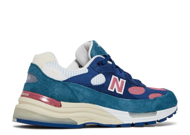 The upper shoelace area and along the heel counter extending to the mudguards are dark blue and light blue color tones respectively. The upper is also accented with pink meshed patches while featuring a white checked hue on the collar and atop the heel section. Brandings are dressed in pink below the heel counter and side panels, while a neutral trait is found on the USA embroidery with a grey fence at the heel tab. The EVA cushioned midsole completes the sneaker's look.