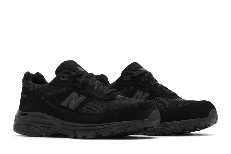 The shoe has a classic and timeless design featuring a layered upper made from a combination of suede, mesh and other synthetic materials. It has a monochromatic color scheme with black all over, including the sole unit and underfoot. The shoe bears classic New Balance branding, with the iconic "N" logo appearing on the sides, and number 993 on the lateral heel. It also has a USA badge on the heel to signify it is part of the "Made in the USA" series, which emphasizes domestic manufacturing and quality craftsmanship.