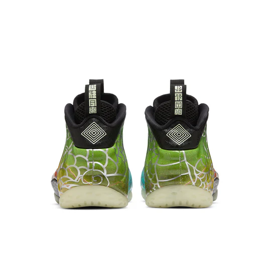 The Nike Air Foamposite installment of the Planet Hoops collection sports a seamless, molded Foamposite upper with a galaxy theme in gradient hues of green to red to purple to blue. A midfoot arch support in black has white speckles, further emphasizing the idea of outer space. This upper is decorated with silver graphics of a dragon to pay homage to Beijing, and the debossed scaly pattern on the black leather overlays at the eyestays and collar further enhance the dragon motif. The stacked foam midsole blends seamlessly into the upper, and the black rubber outsole features a herringbone traction pattern.