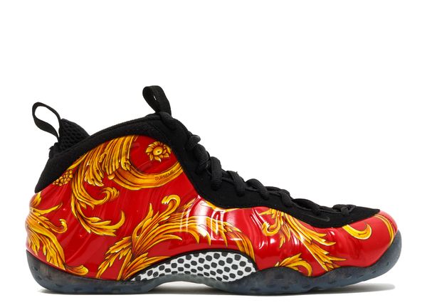 Designed for Supreme's 20th anniversary, the Air Foamposite 1 SP 'Supreme' features a Sport Red Faomposite shell upper highlighted by a Versace-inspired metallic gold graphic. The elevated touch is complemented by black nubuck on the throat and collar, while Supreme branding emerges on the mesh tongue.