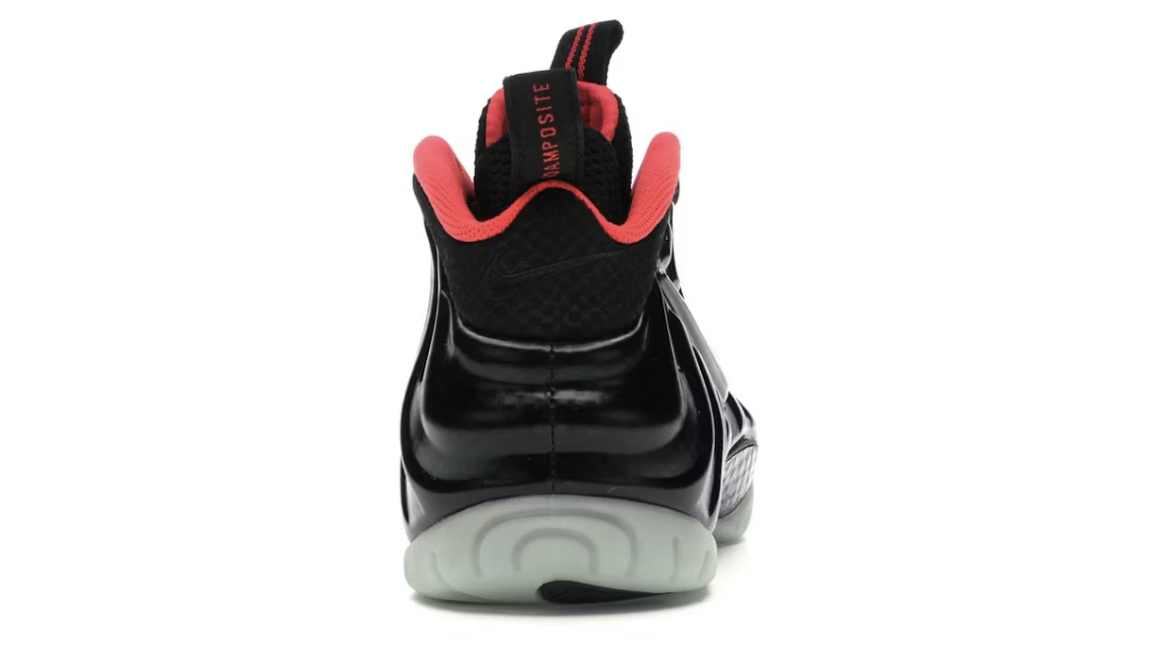 The Air Foamposite Pro Yeezy is adorned with neon red accents with a black upper and a glow-in-the-dark outsole. It features crimson at the heel, liner, and tongue, with eyestays displaying a faux snakeskin pattern. Inspired by Kanye West's 2012 model, a black Foamposite shell and Swoosh team with a black mesh/nubuck upper to design the sneaker.