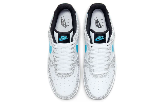 The "Air Force 1 Low Leopard" Nike sneaker in the Low Leopard design showcases a white foundation leather accompanied by shaggy suede overlays adorned with leopard print. It incorporates Blue Fury Swooshes, black leather labels on the tongue and heels, and is finished with a white midsole and see-through outsole for a well-rounded aesthetic.