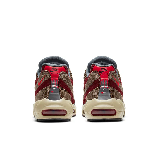The sneaker’s wavy overlays that make up the shoe’s side panels are crafted from textile, with alternating red and brown color accents. This Air Max 95 model features metallic silver detailing at the tongue and heel, which are both wrapped in dripping red accents, according to the movie character´s aesthetics.