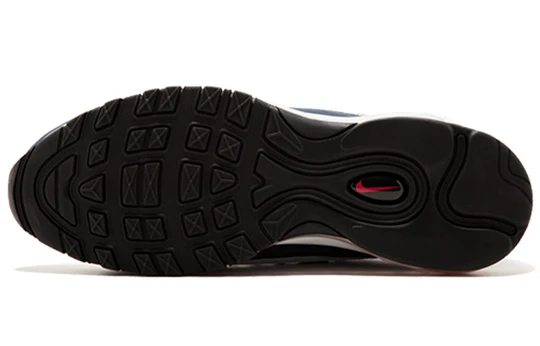 The Air Max 98 upper features a blue mesh and synthetic suede with Royal Black and red detailing. Hits of fossilized Air Max unit foam provide a premium look, while reflective off-white accents complete the sneaker. AIR is printed in black behind the shoe.