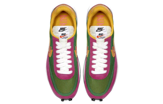 This LD Waffle comes with a pine green upper plus bright magenta accents, del sol and clay orange overlapped Nike "Swoosh", white midsole, and a black outsole.