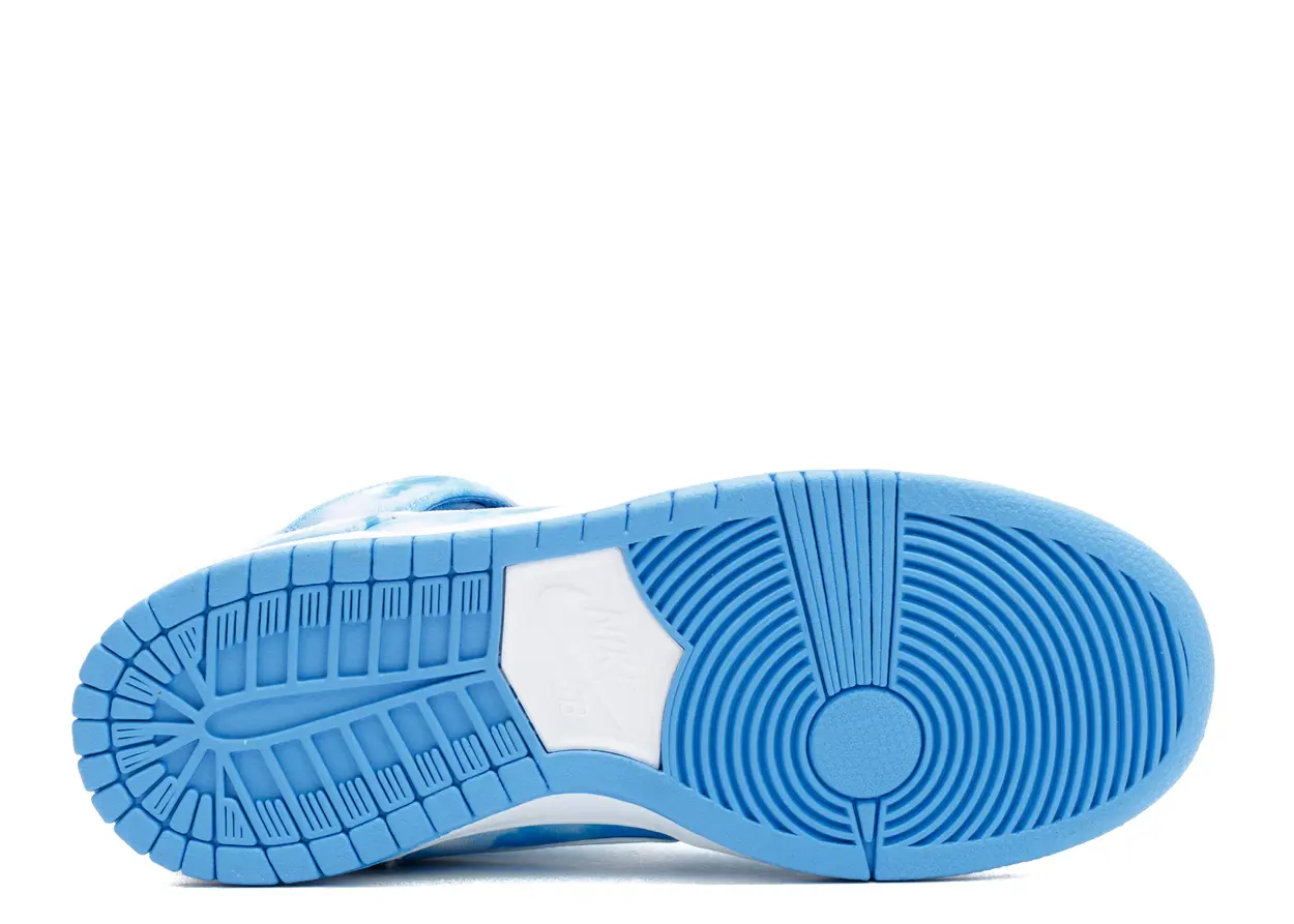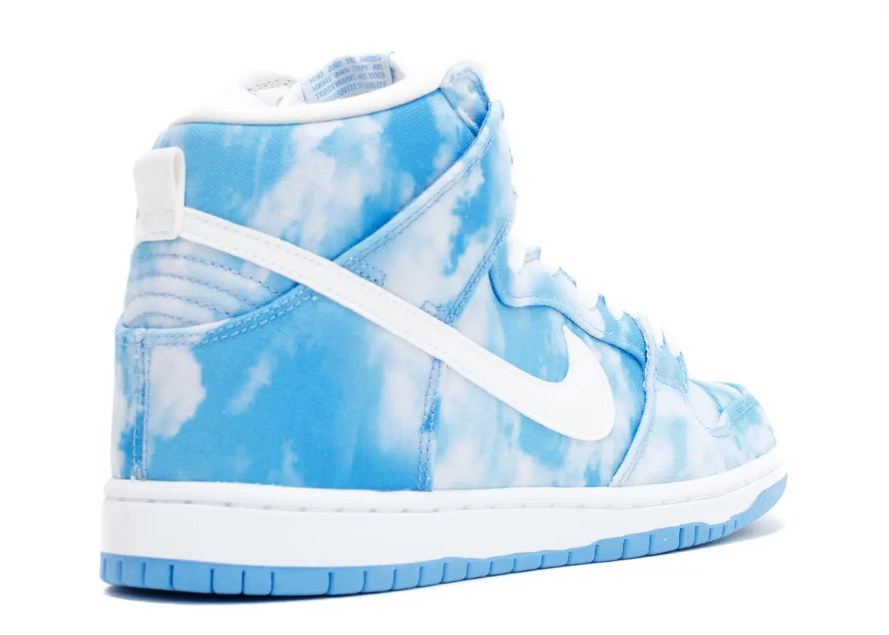 The SB Dunk High ‘Cloud’ showcases an all-over graphic on its canvas upper, one that depicts fluffy white clouds and a bright blue sky. The tranquil design is accented by complementary hits of white on the leather Swoosh, oval laces and padded mesh tongue. The two-tone design up top is repeated on the sneaker’s tooling, made up of a white foam midsole and blue rubber outsole.