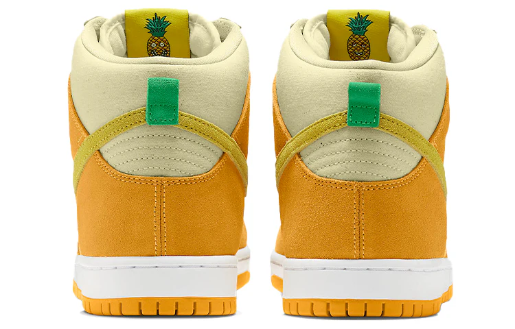 Nike SB Fruit Pack, the Nike SB Dunk High Pineapple features a pale yellow cracked leather upper with golden yellow suede overlays and bright yellow Swooshes. On the inside face of the tongue, a woven label depicting a cartoon-style pineapple character adds a playful look to the silhouette. At the base, a cushioned Zoom Air sole completes the design.