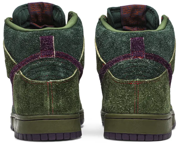 The Todd Bratrud x Nike SB Dunk High-Top Skunk 420 features an upper of fuzzy suede in different shades of green meant to evoke images of the plant from which the skunk is derived. Green laces over a green tongue padded for comfort enhance the horticultural theme. A fuzzy suede purple Swoosh courses across the side panel, a color that matches the fuzzy suede heel tab and the speckled rubber outsole. Above the outsole, an olive green midsole provides cushioning on the deck.