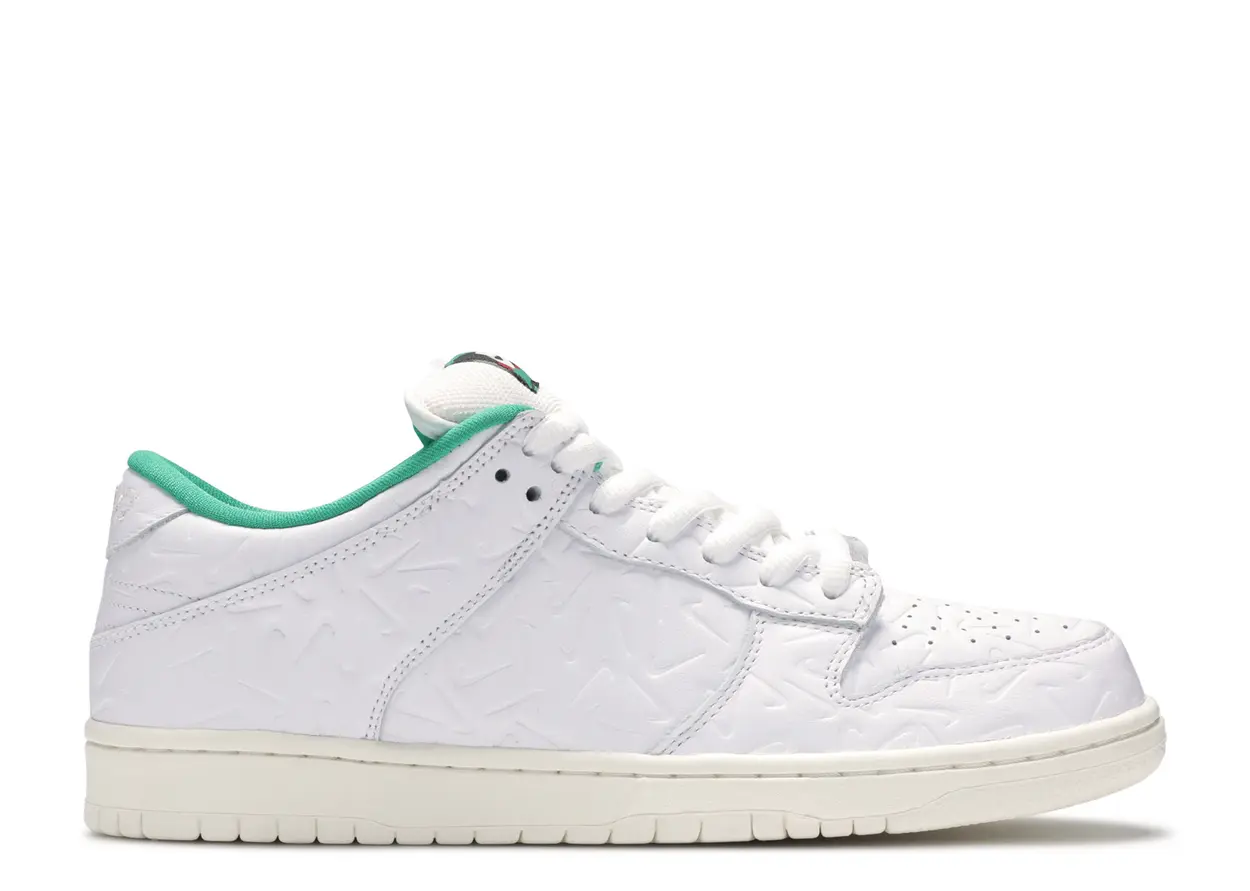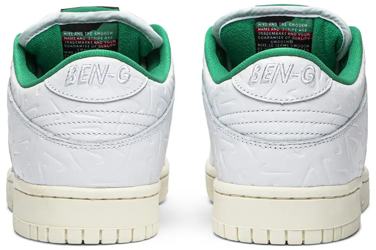 The Nike SB Dunk Low Ben-G features a white leather upper with debossed Nike Swooshes assorted throughout the upper. A cream sole and stuffed SB tongue completes the design.