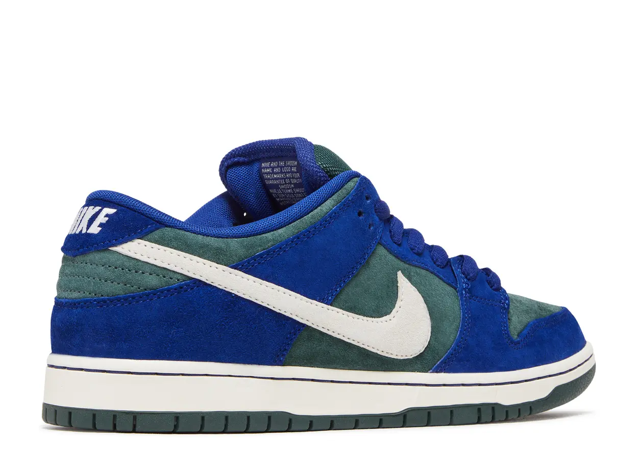 The Deep Royal Blue iteration of the Nike SB Dunk Low-Top features an upper with a base of forest green suede with deep royal blue suede overlays that match the laces. The padded mesh tongue is also deep green, with a royal blue lining that matches the sock liner with padding at the collar. The Nike swoosh is a creamy white suede that matches the embroidered branding on the heel tab and the woven branding on the tongue tag. The deep green insole also features Nike branding.