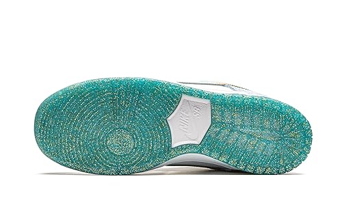 The Nike SB Dunk Low Sean Cliver is filled with holiday cheer. The upper holds a mix of sky blue suede and white tumbled leather, adding luxe looks to the skateboarding sneaker. Next, a metallic gold Swoosh shines on the upper as well, matching a gold speckled, blue outsole and gold embroidered Nike logo on the heel. The sneaker's toe displays air holes patterned after snowflakes, while the insoles continue the festive design by showcasing Christmas elves painting holiday toys.