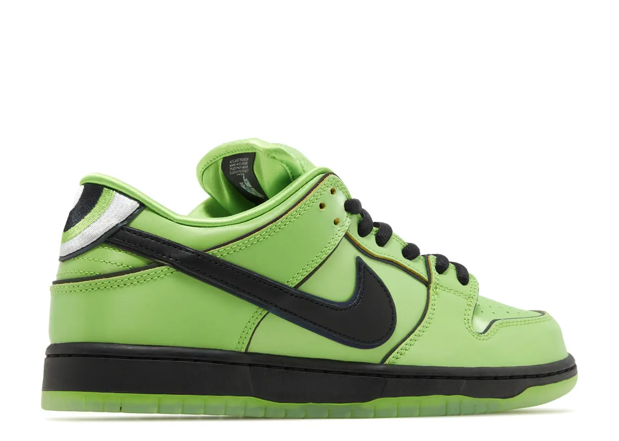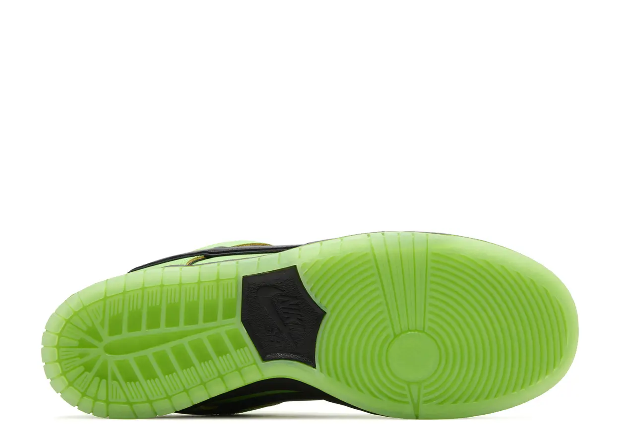 The sneaker's striking color palette is complemented by its high-quality construction and attention to detail, embodying the spirit of the fierce Powerpuff Girl. This Dunk Low is not just a shoe; it's an expression of Buttercup's unyielding energy and charisma.