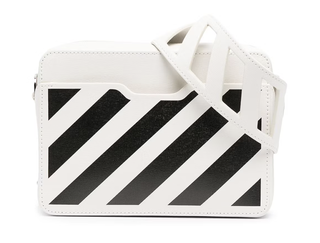 OFF-WHITE Saffiano Striped Binder Clip Camera Bag in White, Black, and Indus. This tote is crafted of grained saffiano white leather. The bag features black stripes, a multicolor strap with the wording “off-white” embroidered on it, and polished silver hardware. The top zipper opens to a black interior with a white leather patch pocket.